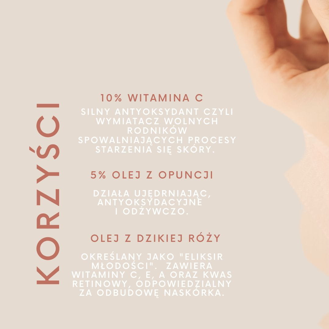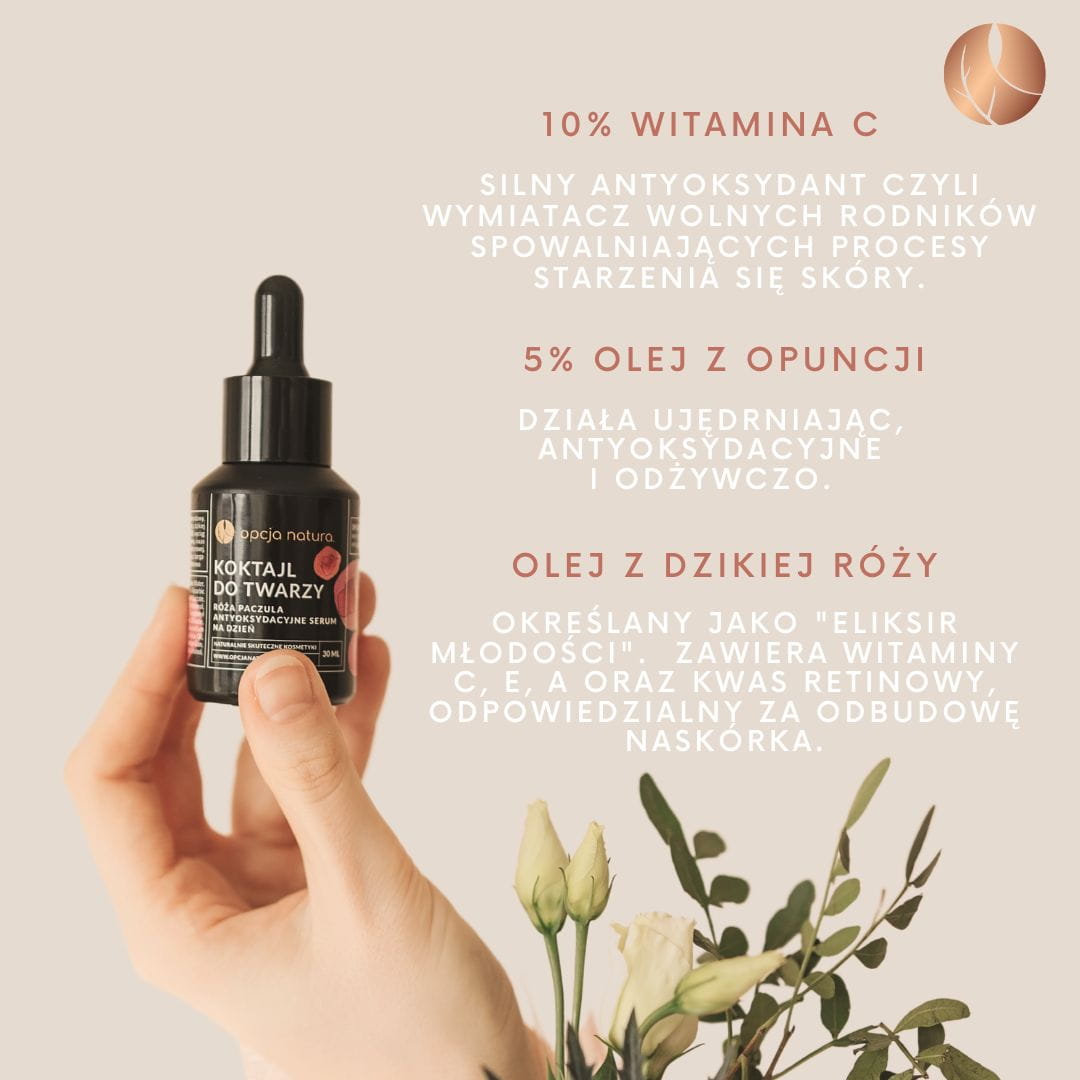 Nasz pomysł na serum antyoksydacyjne na dzień polega na skutecznej walce z niszczącymi skórę wolnymi rodnikami . Dlatego do Koktajlu do Twarzy dodaliśmy do aż 10% witaminy C oraz inne składniki bogate w antyoksydanty: opuncja, dzika róża, żurawina, paczula i witamina E.